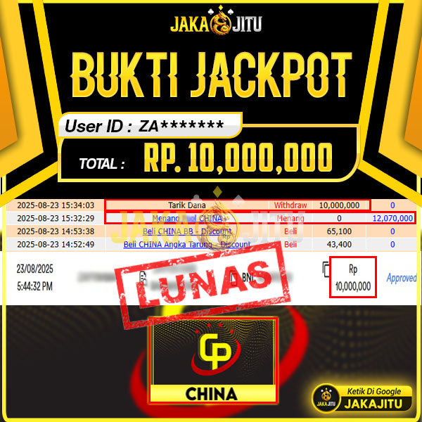 JAKAJITU JACKPOT CHINA POOLS Rp. 10.000.000,- LUNAS