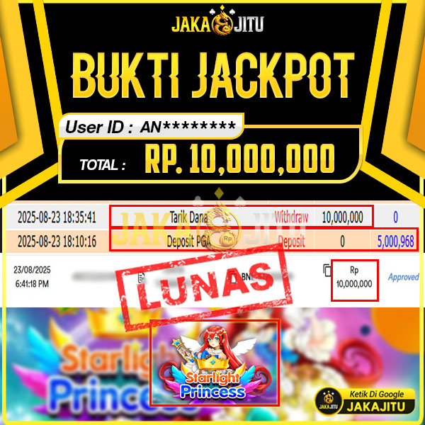 JAKAJITU JACKPOT STARLIGHT PRINCESS Rp. 10.000.000,- LUNAS