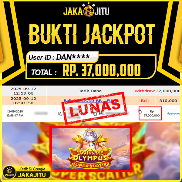 JAKAJITU JACKPOT GATE OF OLYMPUS SUPER SCATTER Rp. 37.000.000,- LUNAS