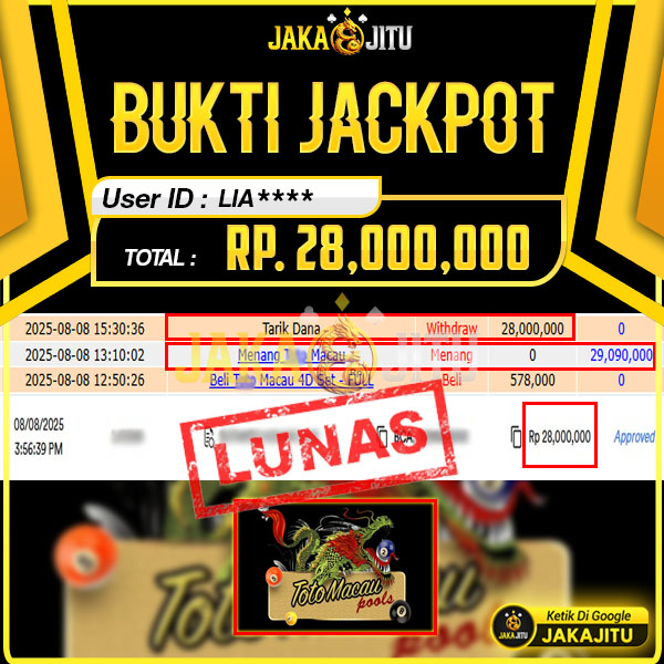 JAKAJITU JACKPOT TOTOMACAU 4D Rp. 28.000.000,- LUNAS