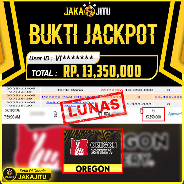 JAKAJITU JACKPOT OREGON LOTTERY Rp. 13.350.000,- LUNAS