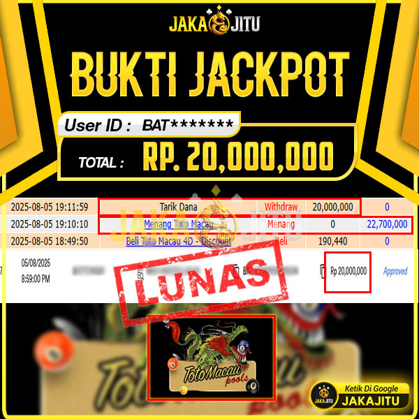 JAKAJITU JACKPOT TOTOMACAU 4D Rp. 20.000.000,- LUNAS