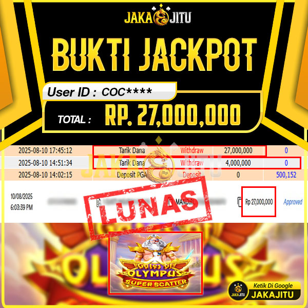 JAKAJITU JACKPOT GATE OF OLYMPUS SUPER SCATTER Rp. 27.000.000,- LUNAS