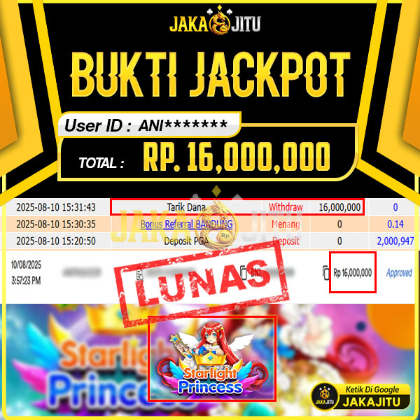 JAKAJITU JACKPOT STARLIGHT PRINCESS Rp. 16.000.000,- LUNAS