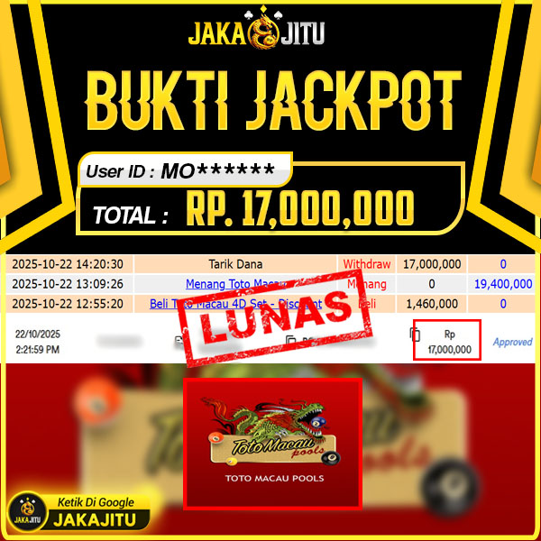 JAKAJITU JACKPOT TOTOMACAU 4D Rp. 17.000.000,- LUNAS