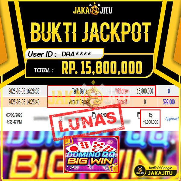JAKAJITU JACKPOT DOMINO QQ BIG WIN Rp. 15.800.000,- LUNAS