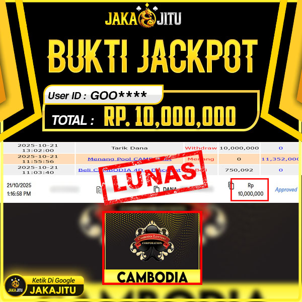 JAKAJITU JACKPOT CAMBODIA POOLS Rp. 10.000.000,- LUNAS