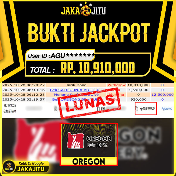 JAKAJITU JACKPOT OREGON LOTTERY Rp. 10.910.000,- LUNAS